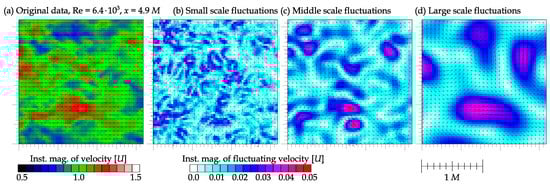 The effect of a such convolution on the velocity field is displayed in Figure 6 for three intervals of length-scales. There is an example of length-scale dependent decomposition also referred as a Agrawal decomposition [,]. A single instantaneous snapshot at and is chosen for this visualization. The scale denoted small corresponds to fluctuations of size or , middle scale means or and the large scale does or . Inst. mag. abbreviates instantaneous magnitude. The velocities are represented in multiples of the mean velocity U.