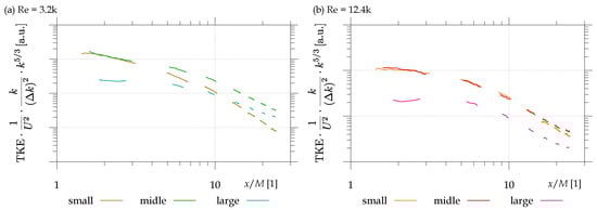 Comparison of the decay of different scale TKE at two selected Reynolds numbers: (a) and (b).