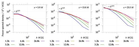 The small scale turbulence decays faster than the middle scale at low Reynolds number, but, at large Reynolds number, it decays in the same way as middle scale turbulence does. This relates to the vicinity of the Kolmogorov dissipative length-scale , which has been estimated in the previous paragraph. In Figure 9, the Spatial power spectral density of turbulent kinetic energy at three distances from the grid: (left), (center) and (right) are shown. The method of spatial spectrum from non-time-resolved data is described in our article []. The is normalized by the velocity square and grid parameter M, wavevector length k is normalized by M. The solid black line represents the Kolmogorov scaling . The spatial spectra in Figure 9 show a similar conclusion: a clear viscosity damping effect at smaller Reynolds numbers visible as a deviation from Kolmogorov scaling depicted in Figure 9 as a solid black line. The method of obtaining a spatial spectrum by using spatially resolved data with poor temporal resolution (note that our equipment allow a maximum sampling frequency only ) as described in detail in our article [] and it is based on the energies of Agrawal decompositions of different bands, as described above.