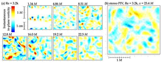 In Figure 10, panel (a), we show an example of instantaneous in-plane vorticity in the 7 studied areas in stream-wise × span-wise direction past the grid at mesh-based Reynolds number . In the top row, the colorscale of vorticity is adapted to that field, while the bottom row, where the vorticity intensity changes not so rapidly, and has a common scale from to . Even by the naked eye we can note the smoothing of structures and (in the bottom row only) the decrease of intensity. In panel (b) of Figure 10, there is an example of instantaneous vorticity obtained by the Stereo PIV technique in a plane perpendicular to the stream-wise direction in distance from the grid . For esthetic purposes, these fields are smoothed by convoluting with Gauss function of grid point. This smoothing is not applied for the plots of statistical moments of vorticity shown later.