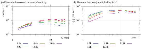 The stream-wise dependence of is plotted in Figure 11 as a function of distance . The data are normalized by using the the ratio of distance from the grid x and average stream-wise velocity U, i.e., a time needed to pass there (note the unit of vorticity being , which can be seen as the time needed for turnover). This normalization to a dimensionless quantity does not work as well as for TKE, because it depends on velocity stronger than linearly. This issue can be fixed partially by multiplying by , which is plotted in the right panel. This exponent has been found experimentally and to our knowledge it has no support in the literature. Anyway, the curves still do not collapse. We see that the data at various Reynolds numbers do not collapse. These data collapse little bit better when multiplying by , which is displayed in Figure 11b. In any case, this quantity is much more sensitive to noise, as it is a derivative quantity.