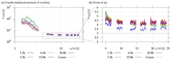 The flatness, i.e., the fourth statistical moment is usually used as a probe of intermittency []. The flatness of Gaussian distribution is calculable analytically and it is equal to 3, which then plays a role of a reference value. High signal means that there is some level of fluctuations (described by standard deviation) disturbed by strong rare events, this behavior is typical for, e.g., neighboring shear layers. The flatness of the vorticity is calculated as