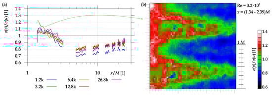 The isotropy, i.e., the independence on the direction, can be best studied by comparing the Reynolds stress tensor components, or its invariants respectively. This can be done only for the stereo PIV data, which we have only at single x. Elsewhere, we can compare at least the ratio of standard deviations of velocity in stream-wise and span-wise directions, []. This is shown in Figure 13 as a function of x. Left panel (a) shows the development of the ratio of fluctuations in span-wise direction () to stream-wise direction () with distance from the grid. The right panel (b) shows one example of the spatial distribution at and at x from to , i.e., in a near grid region, where some spatial distribution related to the shear layers occurs. Green color signifies the same intensity of fluctuations in both investigated directions; red color means prevailing span-wise fluctuations, while blue color shows stronger stream-wise fluctuations. In the near-grid region we see again the effect of regular pattern of jets and wakes.