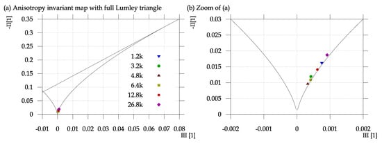 The possible values of invariants and are bounded by the lines depicted in Figure 14 []. Figure 14 shows the spatial average of the values of those invariant over the field of view. The anisotropy invariant map is shown in the coordinates of minus second (-II) and third (III) invariant of the Reynolds stress tensor . These invariants can be calculated only for 3D velocity data, which are obtained by using the Streo PIV, which has been measured at a fixed distance . The so-called Lumley triangle [] of mathematically accessible values is bounded by black lines. The bottom corner at coordinates signifies full isotropy—i.e., fluctuation intensity same in all directions. In the top right corner, there would be turbulence with fluctuations in one direction only, while the left corner is associated with 2D turbulence, see [] for more details.