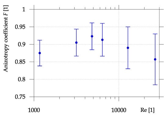 whose dependence on Reynolds number at the distance is plotted in Figure 15. The errorbars represent the standard deviation of this property within the field of view. We see that the flow is almost isotropic ( [,]) according to this parameter and an interesting behavior is that it has a maximum at finite Reynolds number . The reason of anisotropy could be appearance of streaky structures. The character of increasing and later decreasing value of F is unknown for us at this moment, but note that it might be an artifact of the PIV method, which is unable to resolve too small turbulent scales (and Reynolds number is closely related to the ratio of smallest to largest scale).