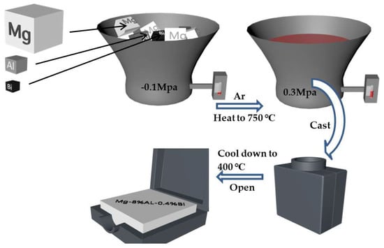 A certain amount of commercial grade metal Mg (99.99%), metal Al (99.99%), and metal Bi (99.99%) were prepared to smelt the Mg–Al–Bi alloy. The addition amounts of Al and Bi are shown in Table 1. The investigated metals were melted in a graphite crucible in a high frequency induction furnace. The pressure in the induction furnace was −0.1 MPa at the beginning by vacuumizing and subsequently, the pressure recovered to 0.3 MPa by accessing argon. Then, the furnace started to heat at a stable heating power at 30% total power to 750 °C. This process lasted 3 min and stayed for 7 min at 750 °C, thus the uneven distribution of alloying elements reduced []. Finally, the molten alloys were poured into a preheated steel mold that was installed in the induction furnace and cooled down to 400 °C to remove from the induction furnace. The entire magnesium alloy preparation process is shown in Figure 1.