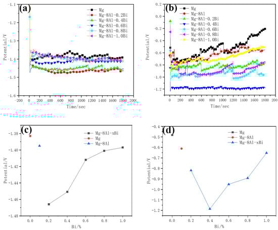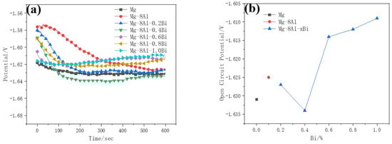 (a) Open circuit potential–time curves of Mg–8%Al–xBi alloys; (b) Open circuit potential–Bi content curves measured in 3.5% NaCl solution.