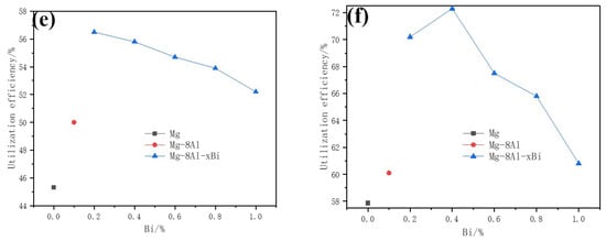 Figure 3 displays the discharge curves and utilization efficiency–Bi content curves of Mg–8%Al–xBi alloys at 30 and 120 mA/cm2. The tests of Mg–8%Al–xBi alloys under different Bi content were investigated. The Mg–8%Al–xBi anodes have more negative potential than the Mg anode and Mg–8%Al anode. The Mg–Al–Bi anodes have relatively stable potential at 30 and 120 mA cm−2, but the Mg anode has serious polarization at 120 mA cm−2 and therefore, reduces its discharge performance. The potentials of Mg–8%Al–xBi, Mg, and Mg–8%Al alloys all shift positively at the beginning of the galvanostatic discharging, then shift negative fast over different periods, and then, continue to move positively. This process is due to the discharge products attached to the electrode surface, which blocks the discharge process. The consequent sudden change in potential indicates the cracking of the passivation film. Finally, a dynamic balance is established between the formation and desorption of discharge products. By comparing Figure 3a,b, the potential change during the steady discharge period becomes obvious as the discharge current increases. This is caused by the accelerated corrosion rate of the electrode and the shedding of α-Mg crystal grains. In general, the Mg–8%Al–0.2%Bi alloy has the most negative potential of −1.466 V and the highest utilization efficiency of 56.6% when it is discharged at the current density of 30 mA/cm2; the Mg–8%Al–0.4%Bi alloy has the most negative potential of −1.185 V and the highest utilization efficiency of 72.4% when it is discharged at the current density of 120 mA/cm2. By comparing Mg, the Mg–8%Al alloy, and the Mg–8%Al–xBi alloy, the potential of the Mg–8%Al–xBi alloy is more negative than that of Mg or the Mg–8%Al alloy and the utilization efficiency is higher. This effect is attributed to the intermetallic Mg17Al12 and Bi oxide, which can destroy the Mg(OH)2 film formed on the anode surface, making the electrolyte easy to contact with the matrix [,,]. The Mg17Al12 phase is good for stripping of corrosion products, avoiding the polarization of the electrode. The addition of Bi makes the potential show a positive trend with the increase in Bi content at 30 mA/cm2. In addition, the potential shows a negative trend with the increase in Bi content from 0% to 0.4% and then, shows a positive trend with the increase in Bi content from 0.4% to 1.0% at 120 mA/cm2. The more negative the alloy discharge potential, the higher the utilization efficiency.