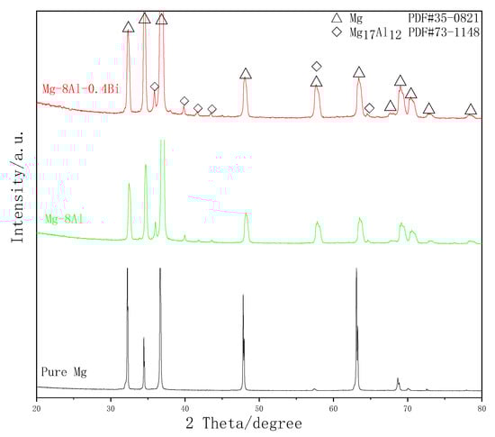 XRD patterns of pure Mg, Mg–8%Al, and Mg–8%Al–0.4%Bi alloy.