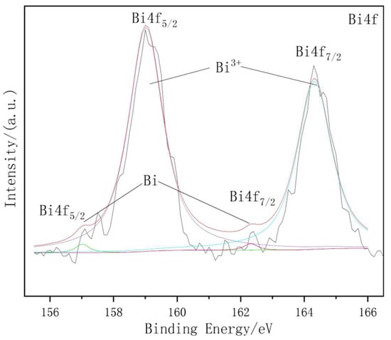 In order to further determine the chemical composition of the Bi element in the discharge product, XPS was used to prove the existence of the low-content element and to detect its valence. Figure 5 is the peak fitting curve of the XPS spectrum of Bi4f for Mg–8%Al–0.4%Bi alloy discharging for 30 min at 120 mA cm−2. It reveals that the XPS spectrum of Bi4f has two high peaks and two low peaks. By fitting data and comparing with standard binding energy, the peak of Bi4f5/2 has a peak of Bi with a binding energy of 157 eV and a characteristic peak of Bi3+ with a binding energy of 159 eV. Due to the presence of chloride ions and the neutral pH of the solution, Bi3+ exists in the form of BiOCl [].