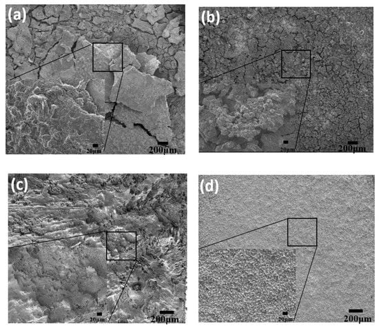 Figure 6a,b show the SEM image of Mg anode and Mg–8%Al–0.4%Bi anode surfaces after discharge at 120 mA/cm2 for 30 min. It is observed that the discharge products are distributed on the anode surface in Mg and Mg–8%Al–0.4%Bi anodes The discharge product of Mg anode is thicker and has fewer surface cracks, while the discharge product of Mg–8%Al–0.4%Bi anode is thinner and has more surface cracks. According to reports, the discharge performance of Mg batteries is related to their appearance during discharge. Cao et al. [] proved that the discharge products attached to the surface of the Mg–Li-Al–Ce–Zn–Mn alloy are loose small pieces. These loose oxidation products allow the electrolyte to penetrate and maintain the anode discharge activity, while the bulk discharge products quickly fall off. Therefore, the cracks that appear on the discharge product shown in Figure 5 will also promote the penetration of the electrolyte into the discharge product and maintain contact with the substrate to maintain its discharge activity, while the thick one with fewer cracks formed on the surface of the magnesium anode blocks the contact between the electrolyte and the anode surface. Therefore, Mg–8%Al–0.4%Bi shows better discharge performance.