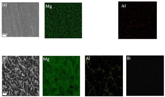 Element mapping of elements Mg, Al, and Bi for (a) as-cast Mg–8%Al–0.4%Bi and (b) Mg–8%Al–0.4%Bi alloy discharged at 120 mA/cm2 for 30 min without discharge products.