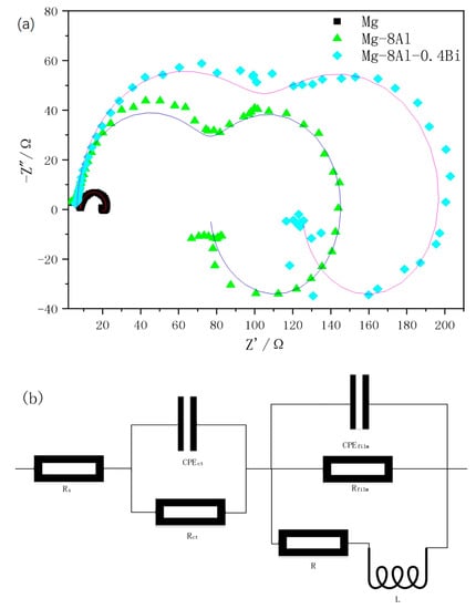 Figure 8 displays the Nyquist plots of Mg, Mg–8%Al, and Mg–8%Al–0.4%Bi measured in 3.5% NaCl solution at 25 ± 1 °C. According to Figure 8, the interfacial processes and corrosion mechanisms are studied. The shapes of the Nyquist diagrams of all three samples are similar, so they have similar electrochemical behavior. All Nyquist plots have three parts: two capacitive semicircles at high frequency and medium frequency, and one inductive semicircle at low frequency. The capacitive semicircles at high frequency and medium frequency are related to electron transfer and the electrochemical double-layer. The larger the radius of the semicircle, the greater the corrosion resistance. The radius of the loops increases according to the order Mg < Mg–8%Al < Mg–8%Al–0.4%Bi. There is a low frequency induction semicircle in almost all magnesium alloys, which may be attributed to the interaction of corrosion products and the corroded alloy surface. The Mg–8%Al–0.4%Bi alloy possesses the highest impedance and it exhibits the optimal corrosion resistance, which is consistent with the results obtained in the immersion experiment. In order to explain the Nyquist plots, an equivalent circuit is used to model the impedance (Figure 8b). Table 3 lists the main EIS parameters of the equivalent circuit fitted by ZSimpWin software. In the equivalent circuit fitting parameters of the Mg alloy, CPEct and Rct describe the electrochemical double layer and the charge transfer resistance, respectively; CPEfilm and Rfilm describe the capacitance and resistance of the passivation film on the alloy, respectively. R and L, respectively, describe the low frequency inductance resistance and inductance resulting from the adsorption of corrosion products. Rs describes the resistance of the solution. The value of Rct + Rfilm determines the corrosion resistance of the material in the electrolyte. The larger the value of Rct + Rfilm, the better the corrosion resistance. The Rct + Rfilm of Mg–8%Al–0.4%Bi alloy reaches 205 Ω, while the Rct + Rfilm of pure Mg is 19.941 Ω. For the Mg–8%Al–0.4%Bi alloy, the observed Rct + Rfilm is much larger than that of the Mg and Mg–8%Al alloys. It shows the Mg–8%Al–0.4%Bi alloy has better corrosion resistance, which is consistent with the results of the immersion experiment.
