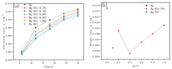 The corrosion rate curves of the Mg, Mg–8%Al, and Mg–8%Al–xBi alloys were compared in Figure 9. It reflects that the Mg–8%Al–0.4%Bi alloy has the slowest corrosion rate and its chemical corrosion resistance is better than that of Mg and the Mg–8%Al alloy. The corrosion rate of all alloys is faster at the beginning of corrosion, then gradually slows down, and finally, tends to be constant. Because a passivation film is formed on the surface of the alloy, the protection of the passivation film and the hydrogen evolution overpotential of the alloy determine the alloy’s corrosion rate. The better protection of the passivation film, the higher the hydrogen evolution overpotential of the alloy, and the slower the corrosion rate. The results indicate that the addition of metal Bi slows down the evolution of hydrogen because Bi is a high hydrogen evolution overpotential metal. Therefore, the chemical corrosion rate of the Mg–Al–Bi alloy is lower than that of pure magnesium and pure aluminum [].