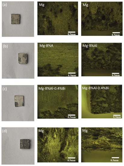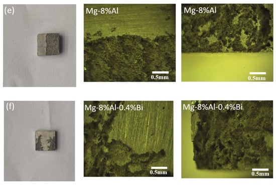The anode surface morphologies of pure Mg and Mg alloys immersed in 3.5 wt% NaCl solution for 12 and 24 h are shown in Figure 10. According to the microstructure and corrosion morphology, corrosion can be classified as either “dotted” or “flaky” corrosion type. The degree of corrosion at the center of the sample is determined by the alloy properties, while the corrosion at the edge of the sample is determined by the alloy properties and edge stress. The corrosion morphology of the Mg–8%Al alloy is similar to that of the Mg–8%Al–0.4%Bi alloy, which is mainly flaky. The metallographic photograph indicates that corrosion started to form small flaky corrosion areas and then, connected into a larger corrosion areas. The formation of larger “flaky” corrosion areas and deep pitting corrosion of pure Mg revealed that the occurrence and spread of corrosion was very fast. That is, pure magnesium can quickly initiate corrosion, but cannot prevent the spread of corrosion. The corrosion products exist in the form of individual large pieces and are not connected into flakes. This leads to a lower corrosion resistance of pure magnesium. The degree of corrosion increases in the order Mg–8%Al–0.4%Bi < Mg–8%Al < Mg. Hence, the Mg–8%Al–0.4%Bi alloy shows the best corrosion resistance, and the pure Mg exhibits the most serious corrosion. In Figure 10, the edge corrosion of pure magnesium is light, but the center corrosion is serious. It has good edge stress resistance, but the matrix has poor resistance to chemical corrosion. The pitting corrosion of pure magnesium spreads to the depths of the magnesium matrix, causing more serious corrosion. The corrosion of Mg–8%Al alloy and Mg–8%Al–0.4%Bi alloy is basically concentrated on the edge, and the corrosion resistance of the matrix is better. Mg–8%Al–0.4%Bi has the least degree of corrosion, so its corrosion resistance is the strongest in 3.5% NaCl without discharge.