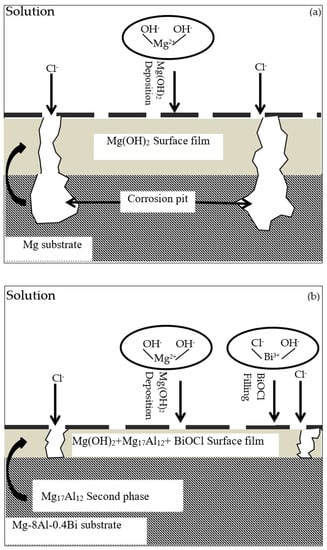 The mechanism diagram of the pure Mg and Mg–8%Al–0.4%Bi alloy discharge process and the cross-section of corrosion products are depicted in Figure 11. Song [] found that during the discharge process of magnesium and magnesium alloys, a protective film of Mg(OH)2 is formed on the anode surface. Because the protective layer is loose in the presence of certain ions (such as Cl- etc.) and cannot peel off quickly, the protective performance of the film is poor and the discharge performance is reduced, as shown in Figure 11a. However, it can be clearly seen from Figure 6 that the surface of the pure Mg is corroded very seriously after discharging in 120 mA cm−2, while the surface of the Mg–8%Al–0.4%Bi alloy is very flat and shows good corrosion resistance, which means the protection of the film formed by the Mg–Al–Bi alloy is greater than that of the Mg(OH)2 film formed by pure Mg in discharge. It can be seen from Figure 6 that after the addition of Al and Bi, the corrosion resistance of the alloy becomes better and the alloy surface film becomes thin. This may be because Bi has a high hydrogen evolution overpotential. In general, the higher the hydrogen evolution overpotential, the greater the resistance of the hydrogen evolution reaction, thereby slowing down self-corrosion. At the same time, the Mg17Al12 and BiOCl produced in the discharge process peel off the Mg(OH)2 film, which improved the discharge performance of the anode, as shown in Figure 11b.