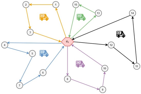 Many types of vehicles can be used in a transport task. The latest trend in the literature is the use of environmentally friendly vehicles [] and electric vehicles []. Another new trend is, for example, the VRP with profits and consistency constraints [], feeder VRP [], cumulative capacitated VRP [], VRP with cross-docking [], VRP with perishable food products delivery [], risk constrained VRP [], VRP with delivery and installation vehicles [], clustered VRP [], VRP with trailers and transshipments [], VRP with traffic congestion [], and dynamic VRP [].