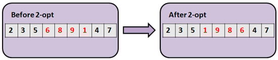 Figure 2 presents the 2-opt [] operator. This operator operates on one solution. A section is chosen, and the elements are exchanged. This means an exchange of two edges.
