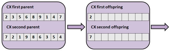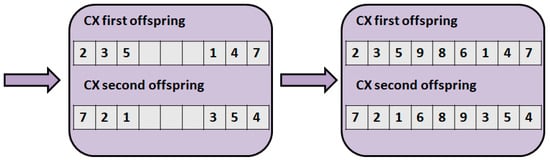 Figure 3 illustrates the cycle crossover (CX) []. During this method, we search for cycles. Initially, the first offspring gets the first position of the first parent, and the second offspring gets the first position of the second parent. In our example, the first offspring gets 2 and the second offspring gets 7. After that, the second offspring has 7, so the first offspring must also have 7. Therefore, the first offspring gets 7 in the appropriate position, and the second offspring gets 4 in the appropriate position. After that, the (4,5) pairs are chosen, then the (5,1), (1,3), (3,2). After (3,2) is chosen, the circle closed. As the last step, the first offspring gets the numbers from the second parent in the remainder position, and the second offspring gets the numbers from the first parent.