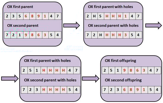 Figure 4 illustrates the order crossover (OX) []. In the case of this crossover, a fitting section is determined. The length and the position of the fitting section of the two parents must be the same. After that, the parents are copied, these are initially the two offsprings. In the first offspring, we look for the numbers that the second parent fitting section contains. These numbers are deleted, indicated with H letter in Figure 4. In the second offspring, we look for the numbers that the first parent fitting section contains. After that, the holes (H letters) are pushed up to the fitting section. In the fitting section, the holes are replaced with the following way: the first offspring gets the fitting section of the second parent, and the second offspring gets the fitting section of the first parent.