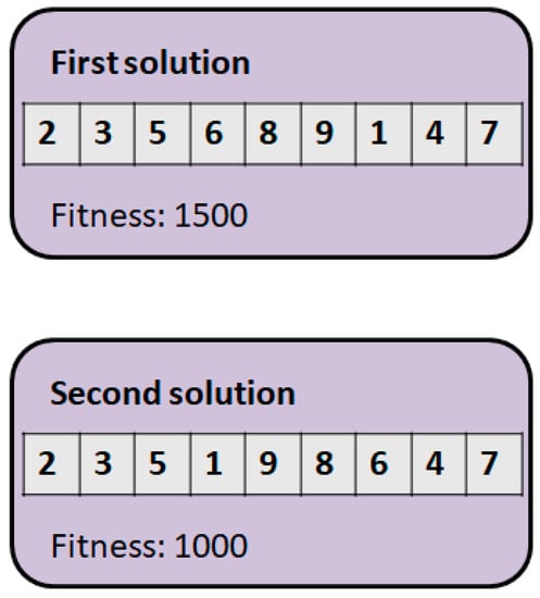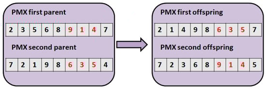 Figure 5 illustrates the partially matched crossover (PMX) [] technique. In the case of this technique, a fitting section is determined. These fitting sections of the two parents must have the same length and positions. After that, pairs are created from the fitting section. In this example, the pairs are the followings: (9,6), (1,3), and (4,5). The creation of the offspring is the following: we copy the parents. After that, the elements of the pairs are exchanged. In our example, the 6 is exchanged with 9, the 1 is exchanged with 3, and the 4 is exchanged with 5.