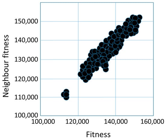 For each search space state point (solution candidate), it represents a point in the coordinate system, where the x-axis represents the fitness value of the “base” state and the y-axis represents the fitness value of the neighbor state of the “base” state point. Formally, , where the fitness value of the “base” state is denoted by , while the fitness value of the “adjacent” (bordering) state is denoted by . We introduce the sets , which can be defined as follows []: