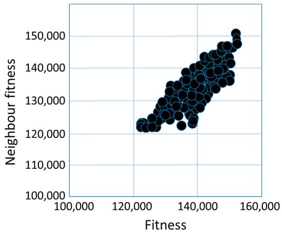 A fitness cloud is a figure that contains the fitness value of the “base” state point and the fitness values of the neighboring states of the “base” state point (bordering fitness) [,].