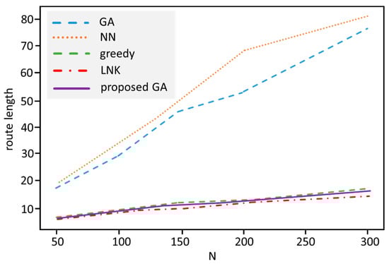 In the literature, we can find a rich variety of heuristic methods to solve TSP problems. A detailed analysis and performance comparison of the main heuristic methods (nearest neighbor [], nearest insertion [], Tabu search [], Lin-Kernighan [], greedy [], Boruvka [], savings [], genetic algorithm [], swarm optimization) can be found among others in [,]. Based on the results presented in that analysis: (a) the fastest algorithms are the greedy and savings method, but they provide an average tour quality; (b) the nearest neighbor and nearest insertion algorithms are dominated by the greedy and savings methods both in time and tour quality factors; (c) the best route quality can be achieved by the application on 3-opt/5-opt methods (Lin-Kernighan and Helsgaun); (d) considering both the time and tour quality, the chained Lin-Kernighan algorithm shows the best performance; (e) the evolutionary and swarm optimization methods are dominated by the k-opt methods both in time and tour quality factors; (f) the tour-merging methods applied on the chained Lin-Kernighan algorithm can improve the tour quality at some level, but it requires a significant more time cost.