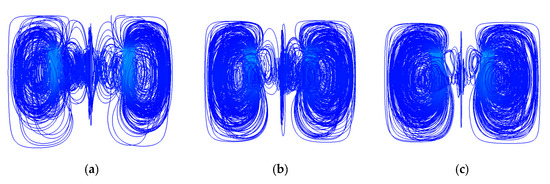 Vortices distribution. (a) L/D = 1.8; (b) L/D = 1.4; (c) L/D = 1.0.