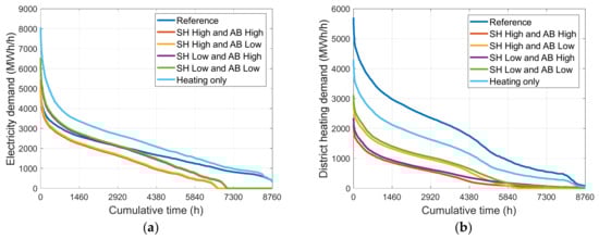 Load duration curves of the (a) electricity demand and (b) of the district heating demand of single-family house (SH) and apartment building (AB) building stock when both were renovated according to different scenarios and the demands for the reference building stock. Note that in (a) the curves for “SH High and AB High” and “SH Low and AB High” are under the curves for “SH High and AB Low” and “SH Low and AB Low” respectively and thus hardly visible.