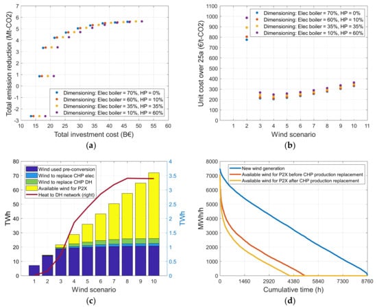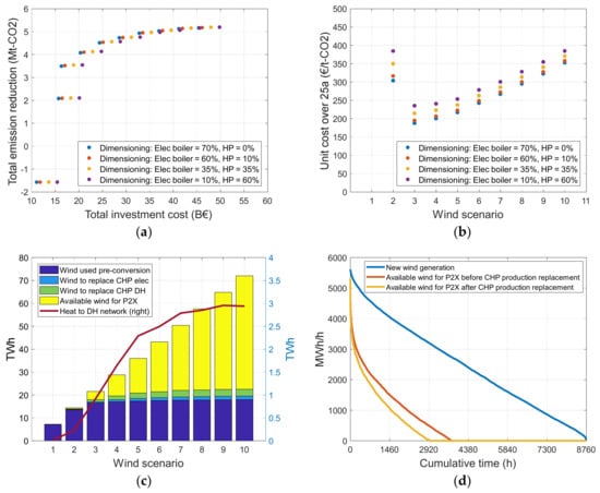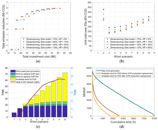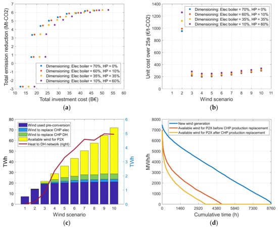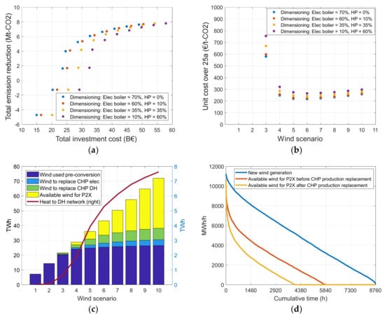 Results of energy system measures when buildings were renovated according to the building renovation scenario “SH High and AB High”. In (a) the total emission reductions and total investment costs for the different wind scenarios and heat conversion options are presented. (b) The unit costs of emission reductions for scenarios that reduced emissions in (a) over 25 years. In (c) the utilization of new wind generation is displayed when heat conversion was done by electrode boilers only dimensioned to 70% of the peak DH demand of the renovated buildings. (d) The load duration curves for new wind generation and the excess generation before and after CHP replacement for wind scenario 3 from (c).