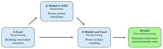 1) The building renovations scenarios for the housing stock were constructed from data from studies [,], which simulated the electricity and heat demands for single-family houses and apartment buildings for different renovation levels. (2) The new electricity demand from the renovated housing stock was applied to the total electricity demand of Finland. Generation considered was: nuclear, combined heat and power (CHP) for industry, CHP for district heat, and existing wind power. On top of this new wind power generation was added with 10 increments and the operation of hydropower was optimized to maximize the utilization of new wind generation. This was performed in a similar manner as in [] with the exception that this study only considered new wind generation and not photovoltaics. (3) In the post-processing the power-to-heat (P2H) coupling was performed where excess wind generation from the power system simulation was utilized to replace electricity and heat from CHP district heat production if there was district heating (DH) demand from renovated housing stock at the hour of excess wind. Additionally, if the electricity demand was not fully satisfied with the generation options considered in the power system simulation, it was matched in this phase. Further, the possible emission reductions and required investment costs for the different building renovation scenarios together with the added wind power and P2H coupling were determined.