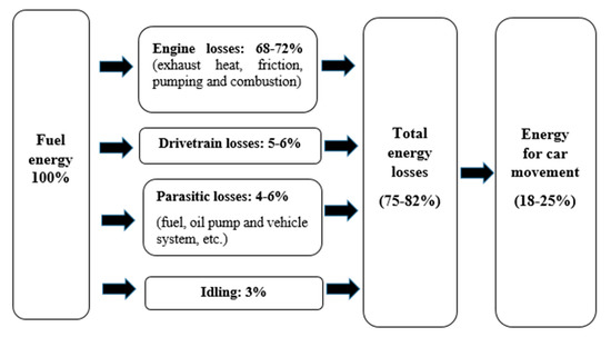 Energy losses in an automobile [20,21]. “Adapted with permission from US Government, Where the Energy Goes: Gasoline Vehicle and the permission from Jordan Hanania, Energy losses”.