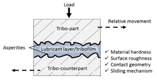 Tribology is the study of the science of interacting surfaces or two moving bodies in relative motion. It is related to friction, wear, lubrication, degradation of metal surfaces, corrosion, engine life, and energy losses. Since there are incredibly high energy losses due to this phenomenon, such losses caused by friction and wear should be minimized [16]. To satisfy the lubrication requirements of the particular application, specifically in tribological aspects, the most important way is selecting a suitable lubricant. Lubrication, friction, and wear are related to tribological performance. Lubricity is concerned with the formation of a protective layer or tribofilm on the contact surfaces. High lubricity reduces direct surface contact, thereby reducing friction and energy losses [17]. However, having a high lubricity is not always accompanied by better wear protection, because the formation of a protective layer on the rubbing surfaces happens through the absorption of the surface-active substance of lubricants such as base stocks or additives. When surface asperity contacts each other, three types of mechanical wear are possible resulting in the following: adhesion, abrasion, and fatigue [18]. Adhesive wear occurs when high loads, high temperature, or inadequate lubrication cause two relatively moving surfaces asperity welds and then immediately tear apart. Abrasive wear happens when surface rubbing occurs between contact surfaces of relative hardness. Fatigue wear is the progressive and localized structural damage of material in repeated loading [19]. Prior to discussing the tribological performance of the nanolubricants, it is necessary to understand the three basic tribology parameters, which are the mechanical properties of a tribological system, lubrication, and the physicochemical properties of the lubricant [19].