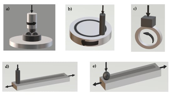 Commonly used tribological test geometry configuration: (a) four-ball tribometer, (b) pin-on-disc, (c) block-on-ring, (d) pin-on-flat, and (e) ball-on-flat.
