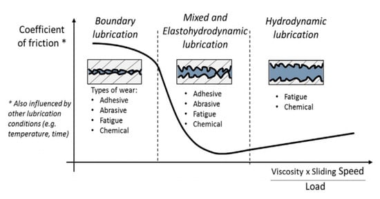 Lubrication is essential to overcome and reduce friction between two interacting parts. According to the Stribeck curve, there are three well known lubrication regimes. The first regime is boundary lubrication (BL), second regime is mixed and elastohydrodynamic lubrication (EHL), and the third regime is hydrodynamic lubrication (HL) [25], as shown in Figure 4. BL happens when repeated loading/high load or low sliding speed generates heat and causes high wear and energy losses because of the unstable and thin tribofilm that forms on the rubbing surfaces. Thus, lubricant additives are important to protect the friction surface(s) [26]. Shock loading is also a factor that results in BL. Again, by further decreasing the load or increasing sliding speed, the lubrication regimes will shift to a mixed/EHL regime and then to a hydrodynamic regime. Through this transition, friction and wear will decrease due to hydrodynamic lift since a thicker tribofilm will separate the contacting surfaces. HL will occur when two interacting surfaces are separated by a tribofilm. In this regime, no significant mechanical wear occurs except fatigue due to the contacts being fully lubricated and the friction dominated by viscous dragging forces [26]. EHL is similar to hydrodynamic lubrication, but this lubrication is involved in the rolling motion. Mixed lubrication is a combination of BL and HL. When under a mixed/EHL regime, the tribofilm had around 1–3 times greater film thickness than surface roughness. Under the hydrodynamic regime, the tribofilm had three times greater film thickness than surface roughness [27]. Besides, the tribofilm in EHL lubrication is much thinner and the pressure exerted is greater than hydrodynamic lubrication. Typically, the coefficient of friction (COF) value of BL will greater than 0.1, while for mixed/EHL lubrication has a range of 0.01-0.10 COF and HL has a COF less than 0.01 [18].