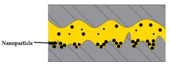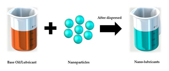 To further minimize wear and friction in the system, small amounts of weight percentage of additives are added to the lubricant base stock to improve and enhance the oil properties. Those additives can be anti-wear (AW), extreme pressure (EP), anti-corrosion, dispersant, and AW and EP additives are especially used to lubricate mechanical parts. One should note that the traditional EP and AW additives are chlorine and phosphorus compounds, which have been restricted in terms of use due to the purpose of environment protection. To overcome this problem and most of the existing lubricants which have reached performance bottlenecks, researchers are currently investigating nanoparticles (NPs) design as a new class of lubricant additives. Most NPs are environmentally friendly and exhibit tribological properties improvement in lubricants since it does not require triboactive elements such as chlorine, phosphorus, and sulphur, which are harmful to the environment [5,6]. Moreover, the nanometer size range of NPs are able to fill contact asperities. They function as AW and EP additives and friction modifiers, obtain high thermal stability, and react with the friction surface without an induction period [7].