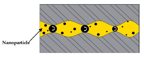 Additionally known as the ball-bearing effect, normally the spherical or quasi-spherical nanoparticles act as ball bearings that roll between the contact surface and convert sliding friction to the combination of sliding and rolling friction [79], as shown in Figure 7. Various studies examining the ball-bearing mechanism have been carried out. Viesca et al. [48] evaluated carbon-coated copper nanoparticles and stated that tribological improvement is related to the ball-bearing mechanism. Wu et al. [55] investigated the tribology properties of TiO2 nanolubricants by ball-on-disk tribometer. They reported this type of nanolubricants evidenced the ball-bearing effect between ball and disk with a demonstration from SEM micrograph as shown in Figure 11a. Raina and Anand [80] demonstrated the nearly spherical shapes of diamond nanoparticles ability to reduce the sliding contact surface, and this is associated with the ball bearing mechanism.