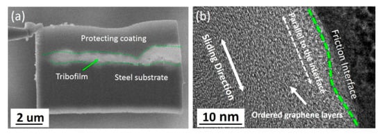 (a) SEM micrograph of tribofilm formation on steel substrate; (b) HRTEM micrograph of tribofilm formation beside the friction interface [86].