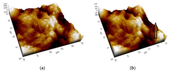 (a) AFM images of friction surface before sliding (surface roughness = 143 nm); (b) AFM images of friction surface after sliding (surface roughness = 68 nm) [76].