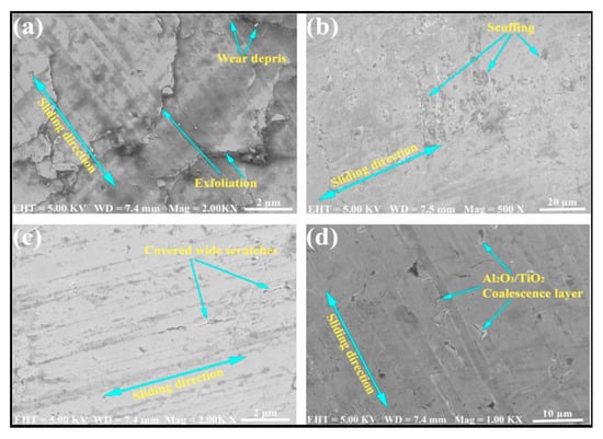 (a,b) SEM micrograph of the worn surface with commercial lubricant; (c,d) SEM micrograph of the worn surface with Al2O3/TiO2 nanolubricants [110].