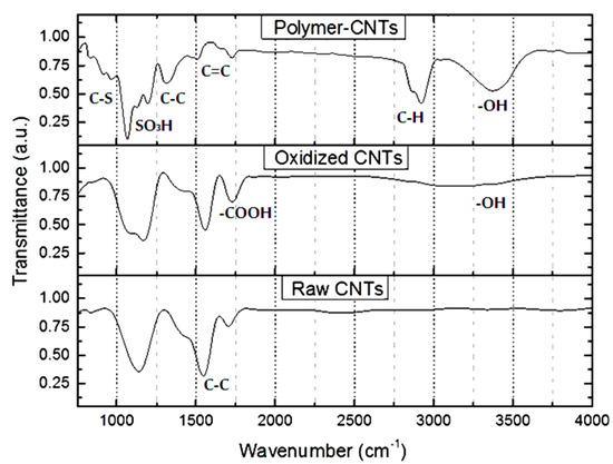 FTIR spectra of raw and functionalized CNTs are presented in Figure 2. The existence of an absorption band at about 1610 cm−1 can be attributed to the C-C stretching in the CNTs graphitic structure [37,38]. It can also be seen from the figure that the oxidized CNTs spectrum exhibit an absorption band at about 1730 cm−1 corresponding to the stretching vibration of the carbonyl groups, and a broad absorption band at about 3240 cm−1 corresponding to OH stretching vibration band [37,38,39]. The presence of these absorption bands confirms the attachments of the carboxylic acid groups to the sidewalls of the CNTs. Similarly, the various absorption bands that appear in the spectrum of the polymer functionalized CNTs confirm the attachments of the polymer chains to the sidewalls of the CNTs. The absorption bands at 840, 1310 and 1521 cm−1 can be attributed to the C-S, C-C and C=C vibrations of the thiophene ring of PEDOT, respectively, whereas the absorption bands at 1195 cm−1 could be related to the SO3H group bonding of PSS. Additional absorption bands can also be seen in the polymer functionalized CNTs spectrum at 2900 and 3350 cm−1, which are mainly due to the C-H and OH stretching vibration bands, respectively [40,41].