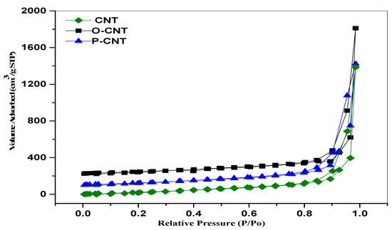 Nitrogen isotherms of pristine CNT and functionalized CNTs are displayed in Figure 3. The adsorption isotherms of all materials exhibit combination isotherm of type II (at greater p/po) and type IV adsorption (at lower p/po) with an H3-type hysteresis loop region of 0.9–1.0, indicating the existence of plenty of mesopores in the material. The surface areas of the CNT, O-CNT and P-CNT were found to be 200.45, 235.12 and 222.14 m2 g−1, respectively, associated with an increase in the pore volume from 0.453 to 0.632 and 0.556 cm3 g−1. The surface characteristics of the functionalized CNTs are higher than those of raw CNTs. This would boost the effective exposure of active sites, resulting in catalytic activity improvement.