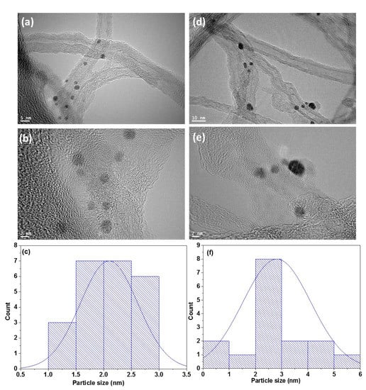 (a,b) High resolution transmission electron microscope (HRTEM) images and (c) particle size distribution histogram of the Au-Pd/ O-CNTs and (d,e) High resolution transmission electron microscope (HRTEM) images and (f) particle size distribution histogram of the Au-Pd/P-CNTs.