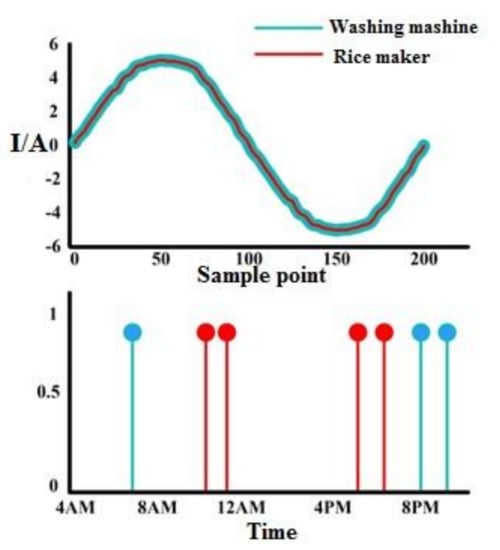 In the process of power consumption information extracting and load state monitoring, selection of load electrical characteristic is vital in this process, which deeply affects the accuracy of NILM. However, no matter how one selects the electrical characteristic, the overlapping of characteristics between the loads is unavoidable, and as an example, the working currents (signals) of the rice cooker and the washing machine shown in Figure 1 are almost the same. As such, the electrical characteristics of the two loads are similar, so the accuracy of the results from the load identification algorithm are likely to be affected. On the other hand, two appliances have different operational regularities, and the rice cooker is most likely to be used around 12:00 p.m. and/or 6:00 p.m., while the washing machine is likely to be used around 7 a.m. and/or 8 p.m. Therefore, switching probability distribution curves for the rice cooker and the washing machine are rather different. If the rice cooker and washing machine were to be identified based on their electrical characteristics, incorrect identification would occur, but analyzing the operation regularity of the two loads can improve the identification results.