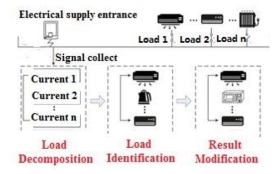 The traditional approach of load monitoring is intrusive in terms of style, in that it installs a sensor with each load to record energy consumption information and power data. Traditional methods can maintain high monitoring accuracy and reliability, but they are impractical as the implementation cost is high and it is significantly inconvenient for residents. To overcome the mentioned problem, non-intrusive load monitoring (NILM) technology was proposed in the early 1980s [3]. NILM technology involves the installation of data-acquisition devices at the electrical supply entry points among residents to obtain the total electrical current (signal). The signal is processed by signal processing techniques to analyze changes in the current going into a residence and deduce what appliances have been switched on/off. NILM technology only uses one data-acquisition device, which makes signal acquisition fast, though monitoring accuracy is decreased when data-acquisition devices are used less. The main research direction here is how to maintain high monitoring accuracy with a non-intrusive style.