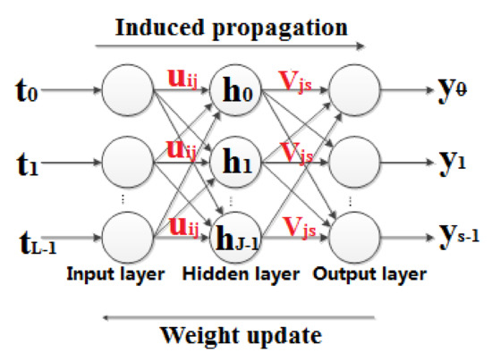 BPNNs generally consist of three layers, namely, the input layer, hidden layer, and output layer. Nodes between layers are connected with neural weights, as shown in Figure 4. BPNN processes induced propagation and weight updates [19]. Regarding processing induced propagation, training data were fed to the BPNN to obtain an induced response. The network error in the BPNN was then obtained by calculating the difference between the expected input data and the induced response. Regarding processing weight updates, the calculated network error was back-propagated from the output layer to the input layer, and the weight of each neuron was updated in order to decrease the network error. This process was repeated until the network error fell within an acceptable pre-determined range.