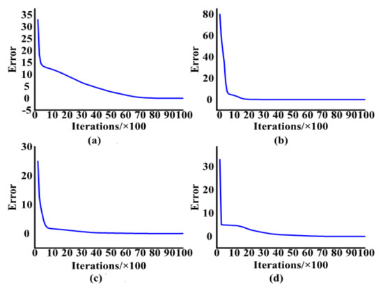 Considering the mentioned example, four load switching times in the specific period are used to train the BP network. In the training process, the parameters of the BP neural network include the number of hidden layers (Nhl), the number of neurons in each hidden layer (Nneu1 and Nneu2), the initial learning rate, iteration times and dropout rate in Table 6. Figure 7 shows the training process, while the network error decreases alongside increases in iteration times in the training process. When iterations times reach 10,000, the error of the four BP networks is close to zero, meaning the training of BP has concluded.