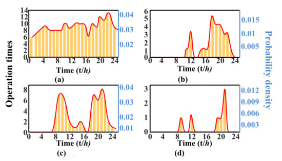 The current study obtained the switching probability distribution curves of identified home appliances. The abscissa is 24 h in day and the ordinate is the probability density. Therefore, the probability of the appliance used in each hour period is the area under the curve within the corresponding time period.