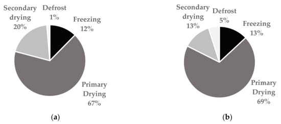The cost of a laboratory-scale freeze-drying cycle was calculated considering typical laboratory-scale process parameters (see Appendix A). As shown in Figure 2a, 67% of the total OC is to be attributed to the primary drying, while freezing and secondary drying accounted respectively for only 12% and 20% of the total. The operational cost related to defrosting can almost be considered negligible, as it represented only 1% of the total operational cost.